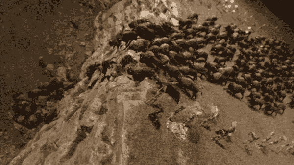 和狼群一样,人们会形成一个包围圈,通过驱赶和挤压,将野牛群变成流体型群体,不断缩小和移动包围圈,用呼喊、恐吓将野牛赶下悬崖,坠落的野牛如同瀑布。