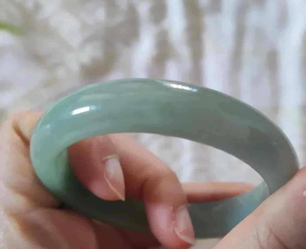 结果在某宝种树时推荐我看,一点进去,又是正在卖玉,然后刷到一个正好是我的大小,里说是“甜绿色”,什么质地也没说,但说是无纹无裂,感觉质地细腻,只卖的6600,主播和评论里都在说捡漏,小圈口的福利,主播刚上播的福利,于是我在差点要错过时赶快捡漏拍下。