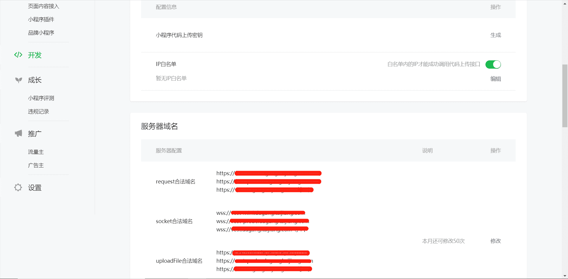 微信小程序支持发起通用请求、文件上传下载、WebSocket通讯机制, 在开发微信小程序的过程中,微信小程序官方强制使用https协议进行网络请求数据传输。小程序请求的域名必须经过微信小程序管理后台通过服务域名设置特定的安全域名(见下图),微信小程序仅能访问已经配置的安全域名下的url,确保网络请求是安全的。