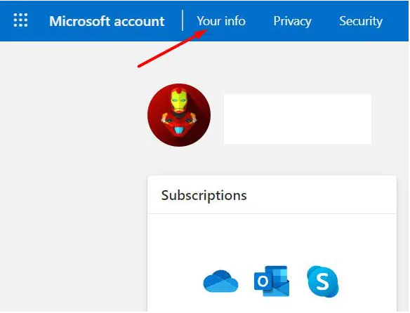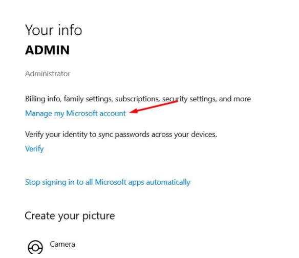 2、点击右边的“Your info”,再点击“Manage my Microsoft account”。