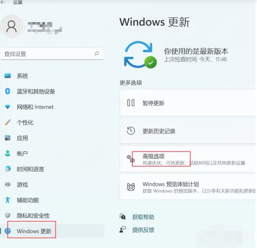 3、接下来找到左侧点击“windows更新”,找到“高级选项”点击进入。