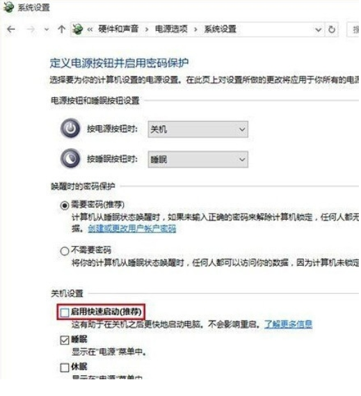 5.然后在“关机设置”下找到“启用快速入门(推荐)”,删除该选项前面的复选标记,然后单击“保存更改”。