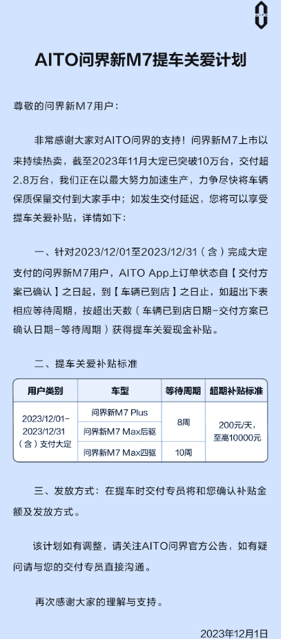 据本站了解,这项新推出的“提车关爱计划”针对的是在2023年12月1日至12月31日之间完成大额支付的问界新M7客户。根据计划规定,如果客户的车辆交付日期延迟,他们将有资格获得一笔现金补贴。具体来说,该补贴将根据客户从订单状态在AITO App上显示为“交付方案已确认”到“车辆已到店”的时间周期来计算。如果这一周期超出了预定的等待时间,公司将按照超出的天数给予现金补贴,以此来弥补客户因交付延迟而产生的不便。