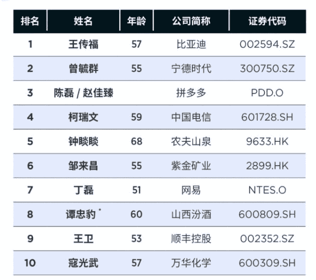 【本站】7月12日消息,福布斯中国今天发布了2023年福布斯中国最佳CEO榜单,评选出了50位杰出的CEO。比亚迪的王传福成功蝉联榜首,成为今年最佳CEO。曾毓群(宁德时代CEO)和陈磊/赵佳臻(拼多多CEO)分别排名第二和第三。