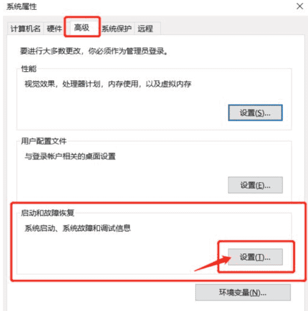 4、弹出系统属性面板,找到高级属性栏,找到启动和故障恢复部分,点击右下方设置。