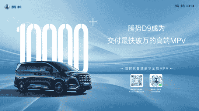 1 月 13 日消息,据腾势官方消息,自 10 月份开启交付至今,腾势 D9 交付量已超 10000 台,成为交付最快破万的高端 MPV。