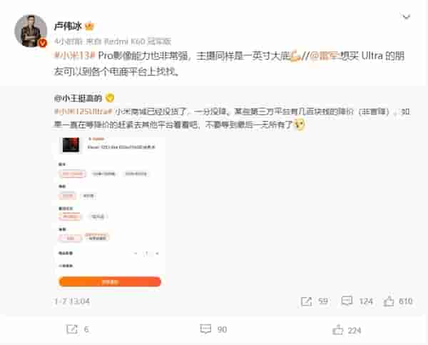 小米12S Ultra官网缺货!卢伟冰推荐小米13 Pro:影像也非常强
