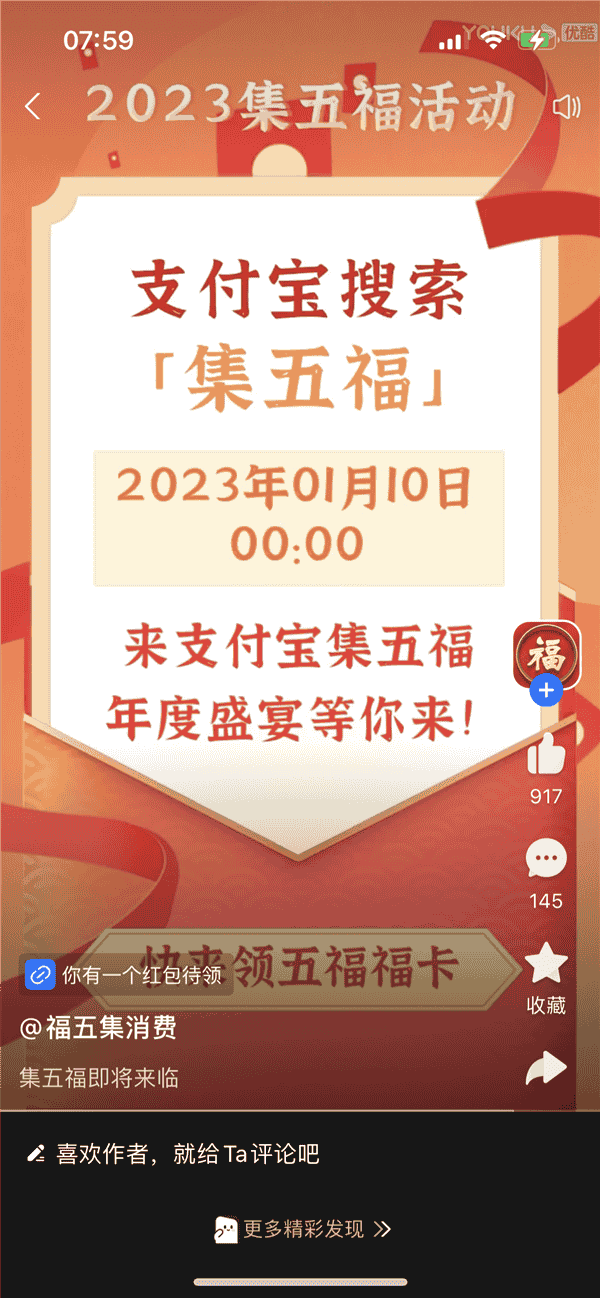 支付宝宣布,“集五福”活动将于2023年1月10日0点正式开启,届时在支付宝搜索“集五福”即可收集五福卡片。