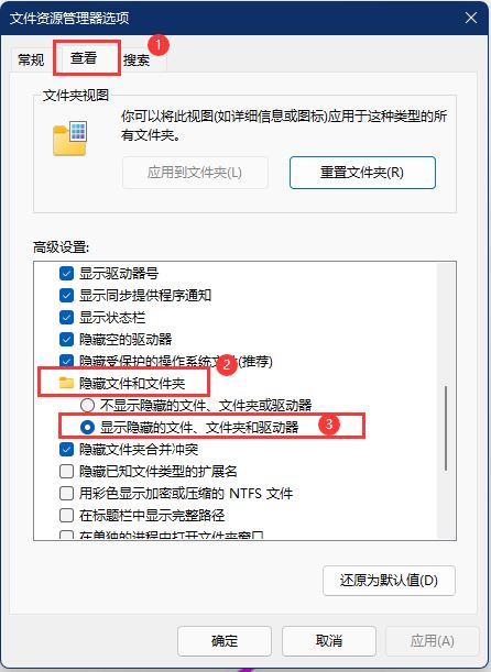 3、来点按下【查看】,将【显示隐藏的文件夹、文件及驱动器】开启。