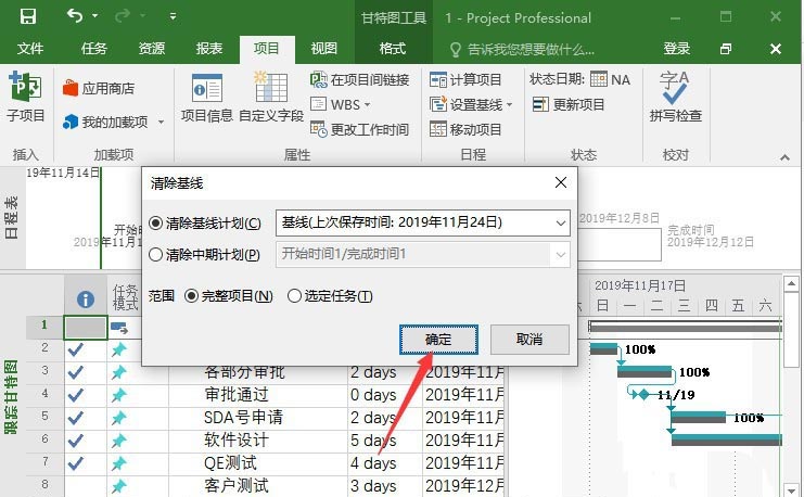 清除基线:打开project-项目-展开设置基线-选择清除基线-确定