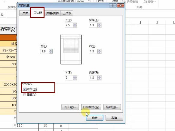 3、然后切换到页边距,将居中方式设置为水平,如下图所示