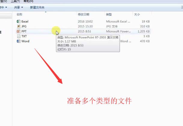 1、首先准备一些不同类型的文件,如下图所示,大家根据自己的情况准备即可