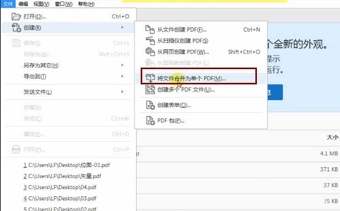 4、接下来我们点击Acrobat软件的左上角的文件菜单,在弹出菜单中选择将文件合并为单个PDF,如下图所示