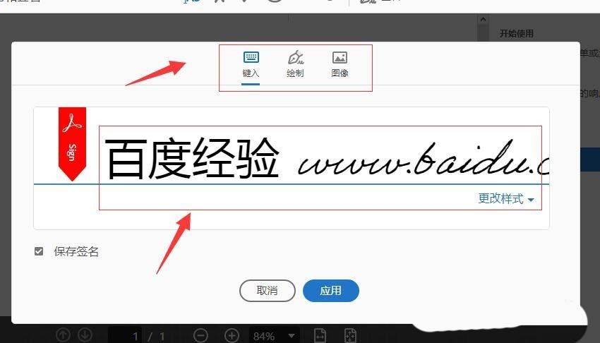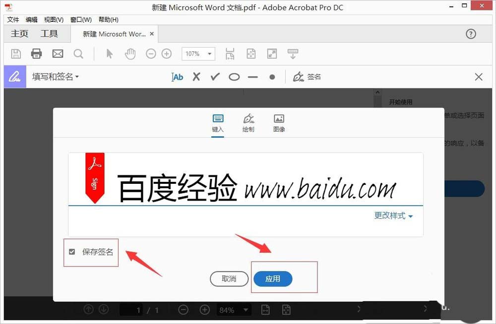 7、完成后,点击“应用”(如果我们需要把签名保存,选中左下角的“保存签名即可”),退出签名编辑界面。如图: