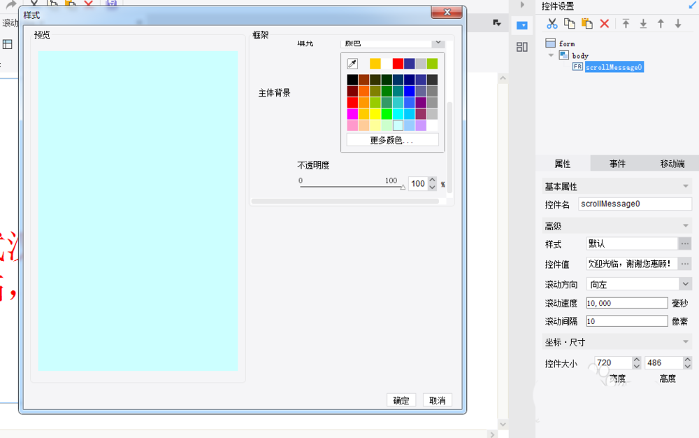 3、选中滚动字幕控件,点击控件值打开富文本编辑器,插入一些文字内容,如下图所示: