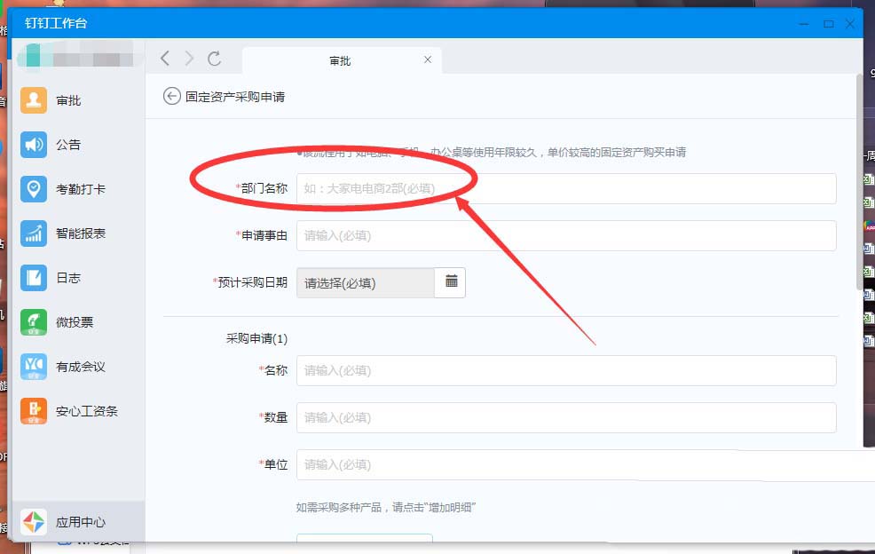 第二步:部门名称。“部门名称”即需要进行固定资产采购申请的部门名字;如下图: