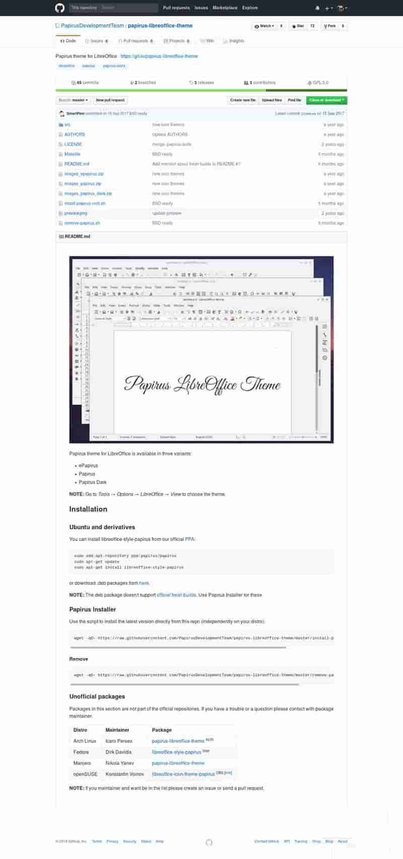 5、你也可以在互联网上找到其它主题。Github上也有不少关于图标、主题之类的软件项目。下图则是“Papirus theme for LibreOffice”项目的页面。