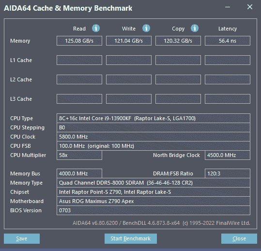 搭配i9-13900KF处理器、Z790主板实机测试中,HOF PRO DDR5-8000MHz内存的读取、写入、拷贝带宽都超过了120GB/s,而延时仅有56.4ns。