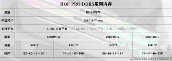 影驰HOF PRO DDR5内存采用精心挑选的IC颗粒,单条容量都是16GB,可选6800MHz、7200MHz、8000MHz三种频率,对应时序分别为32-42-42-109/36-42-42-109、36-46-46-116、36-46-46-128。