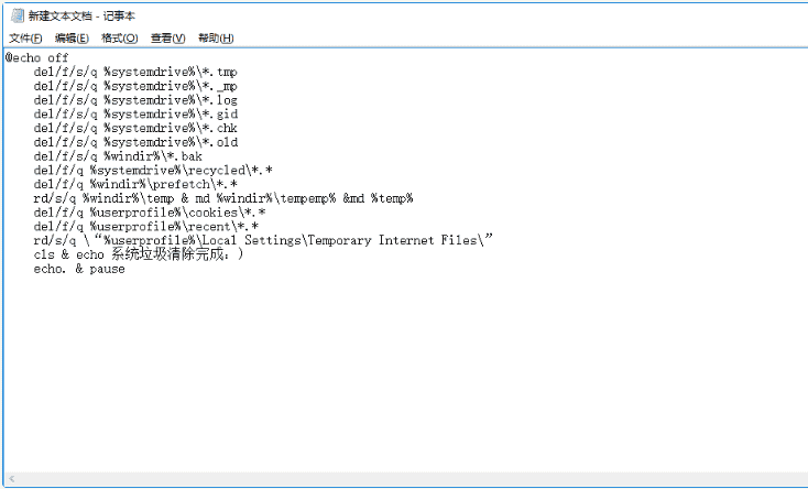 二.将以下代码复制到文本文档中:@echooffdel/f/s/q%systemdrive%\*.tmpdel/f/s/q%systemdrive%\*._mpdel/f/s/q%systemdrive%\*.logdel/f/s/q%systemdrive%\*.giddel/f/s/q%systemdrive%\*.chkdel/f/s/q%systemdrive%\*.olddel/f/s/q%windir%\*.bakdel/f/q%systemdrive%\recycled\*.*del/f/q%windir%\prefetch\*.*rd/s/q%windir%\temp&md%windir%\tempemp%&md%temp%del/f/q%userprofile%\cookies\*.*del/f/q%userprofile%\recent\*.*rd/s/q\“%userprofile%\LocalSettings\TemporaryInternetFiles\”cls&echo完成系统垃圾清除:)echo.&pause