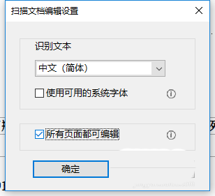 3、点击图中右下角扫描文档下的“设置”,在弹出的窗口中勾选“所有页面均可编辑”,点击确定,再点击编辑图像时,就可以全篇识别了。