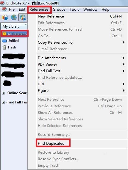 4、这是自动去除重复文档的操作,但是对于已经插入的PDF文档如何查重呢,选中all reference栏,点击菜单栏中的References,选择下面的Find Duplicates