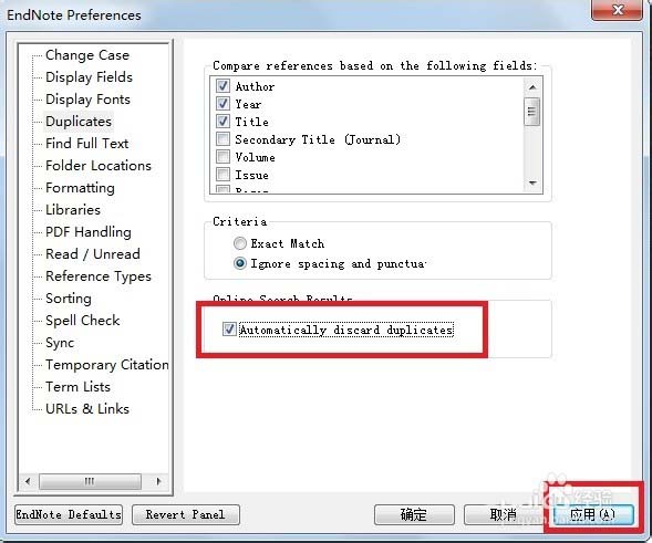 3、设置好后,我们将Atuomatically discard duplicates前面的勾在勾上,点击确定,这样在下次导入PDF文档时,如果出现重复文档,Endnote就会自动的去除重复的文档