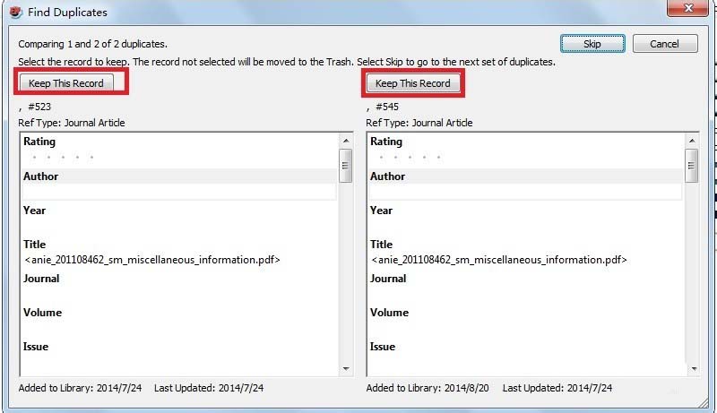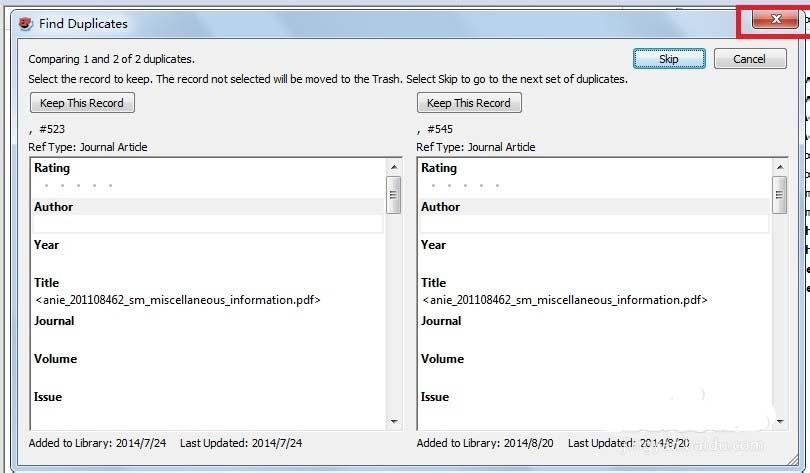 5、Endnote就会自动找出那些重复的文献,对于不想删除的文献,点击keep this record