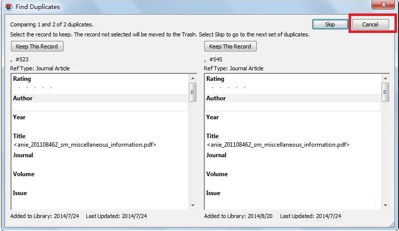 6、筛选好你需要保留的文档后,直接点击cancel,这样那些重复的并且没有选择保留的文档都会被去除
