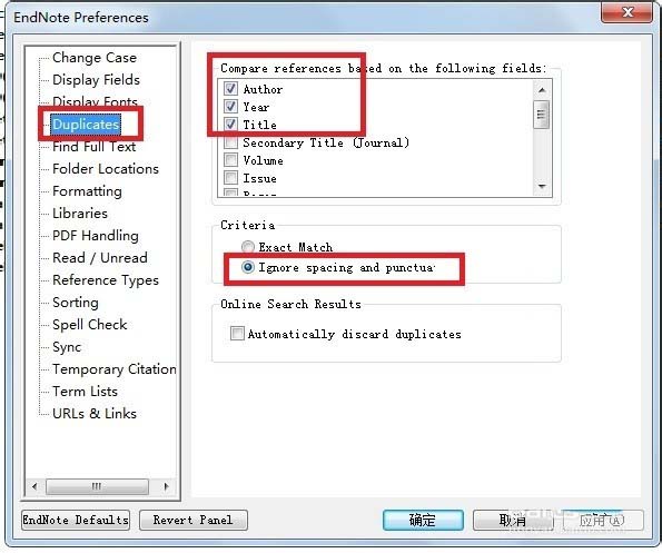 2、在弹出的Endnote preferences对话框中,选择第四个Duplicates(重复),在对话框的右边,我们就可以设置标准了,一般以作者、姓名以及题目相同就会判定为重复,勾选前三项,并且选择ignore spacing and punctna