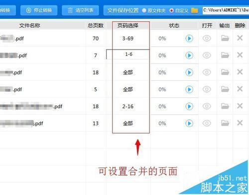 4、如果合并的文档中,某个文档只需要合并部分页面,也可以在页面选择中进行设置,输入对应的页码或页码范围即可。
