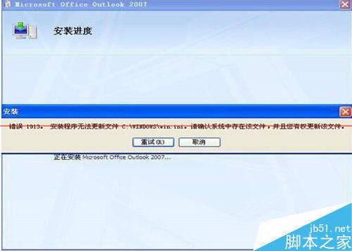 在安装office时提示安装错误 1913。无法更新 ini 文件 WIN.INI。验证文件是否存在以及您是否可以访问它。您只能选择为 重试 和 取消。该错误消息重复单击 重试,和安装将回滚时如果您单击 取消。