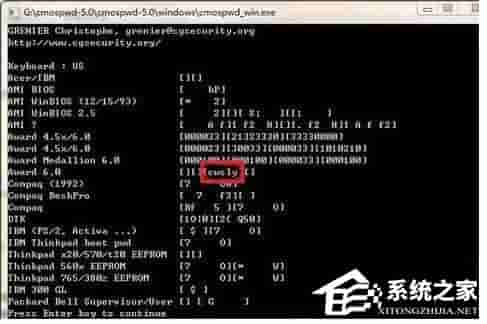 6、也可以使用Cmospwd软件在命令提示符窗口查看BIOS密码,它支持Acer、AMI、AWARD、COMPAQ、DELL、IBM、PACKARD BELL、PHOENIX、ZENITH AMI等多种BIOS,操作方法是:在DOS下启动该程序,BIOS密码就会显示出来的。