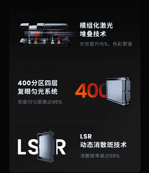 MALC目氪™全称 microstructure adaptive laser control,可直译为“微结构动态激光控制”, 同时音译为“目氪”。目氪™基于最前沿的三色激光,在光路设计、合光&匀光以及成像显示全链路实现了探索创新。