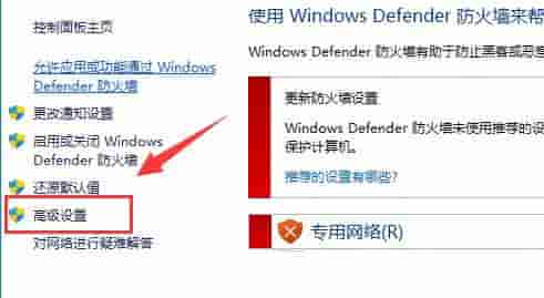 4、Windows Defender 防火墙打开后,点击左侧边栏的高级设置;