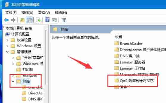 4、左侧点击网络,右侧找到并双击QoS 数据包计划程序;