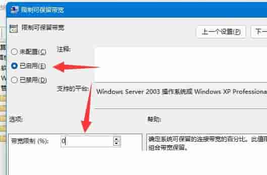 5、限制可保留带宽窗口,选择已启用,并将下方带宽限制改为0,最后点击确定保存即可;