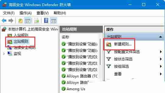 5、高级安全Windows Defender 防火墙窗口,点击左侧出站规则,再点击最右侧新建规则;