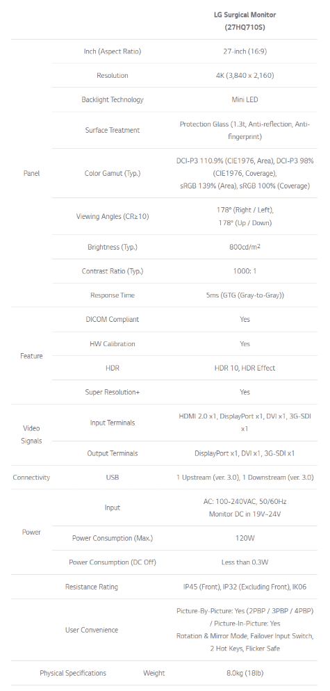 此外,这种新型手术显示器还提供了针对手术环境优化的光学粘合玻璃,提高了耐用性和可靠性。27HQ710S 减少了剧院照明的干扰反射,同时该产品正面和背面拥有 IP45 和 IP32 的防反射、防泼溅、防指纹等级,外加紧凑且易于清洁的设计,总体来说还是很实用的。