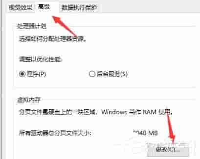 6、然后再进入“高级”选项卡,点击虚拟内存下方的“更改”