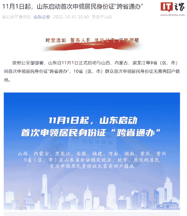 10 月 31 日消息,据山东公安发布,按照公安部部署,山东自 11 月 1 日正式启动与山西、内蒙古、黑龙江、安徽、福建、河南、湖南、重庆、贵州等 9 省(区、市)间首次申领居民身份证“跨省通办”,10 省(区、市)群众首次申领居民身份证无需再回户籍地。