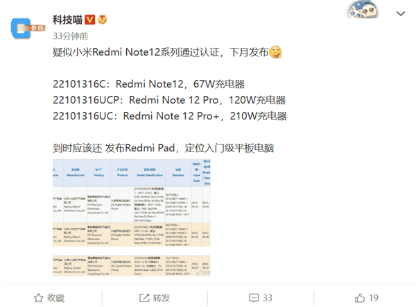 据知名数码博主@科技喵 最新发布的信息显示,疑似全新的Redmi Note 12系列已正式获得3C认证,至少包括22101316C、22101316UCP和22101316UC三个型号,分别对应Redmi Note 12、Redmi Note 12 Pro和Redmi Note 12 Pro+。同时从认证信息显示的细节来看,三款机型将分别配备67W充电器、120W充电器以及首次出现的210W充电器。值得注意的是,目前快充规格最高的是iQOO 10 Pro的200W快充,而Redmi Note 12 Pro+有望将快充的时间进一步缩短。