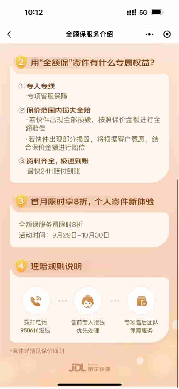 目前,全额保服务费首月限时8折,活动时间为9月29日至10月30日,另外,该服务主要针对于个人消费者用户,月结客户以原有产品及服务规则为准。