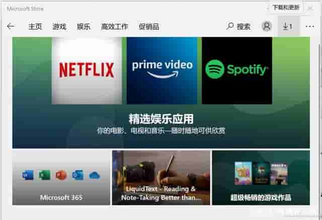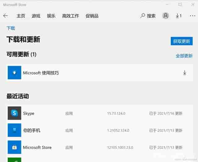 当然,这种情况下我们就需要手动更新从Windows商店下载的应用了。同样在Windows商店主界面的右上角,如果有需要更新的应用,会显示一个下载箭头及数字。点击这个箭头进入更新界面,点击软件后的下载箭头更新或直接点击全部更新即可。
