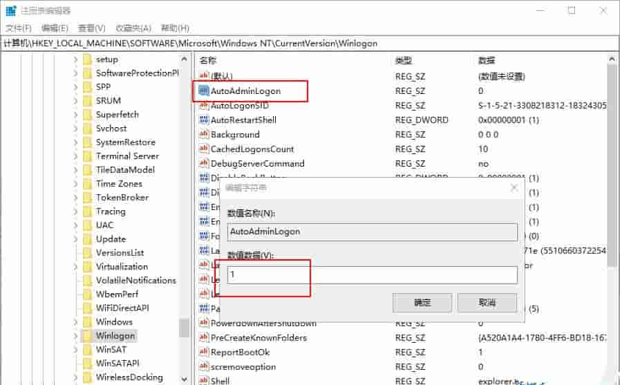 3、在右侧窗口中找到名为【AutoAdminLogon】的字符串值,并将其设置为【1】。