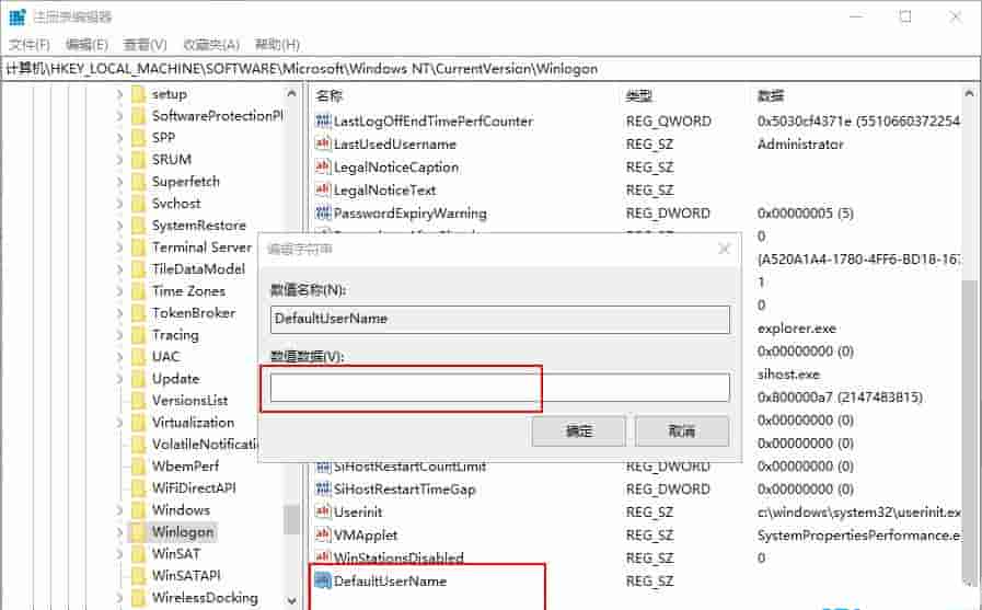 4、在右侧窗口中找到名为【DefaultUserName】的字符串值,在里面填入要自动登录的默认账户。