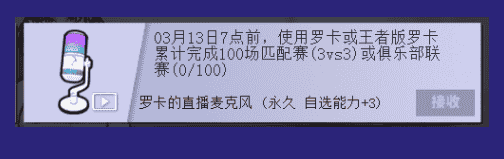 活动以角色为单位,以任务形式展开活动期间内,只有新创建的罗卡和王者版罗卡才能显示和完成该任务。使用该角色完成100场比赛可以获得专属能力装饰。:罗卡的广播麦克风(悬浮装饰,自选能力+3)