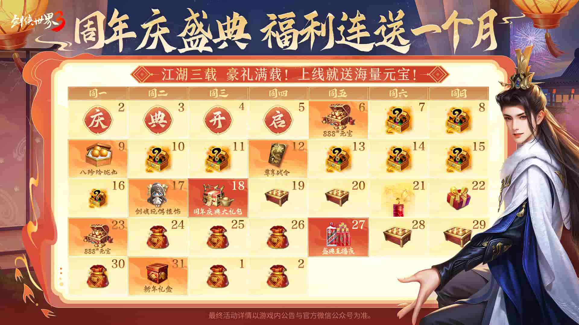 《剑侠世界3》手游年度福利版本来袭!三周年庆典上线,游戏内丰富活动送海量好礼!全新活动金枝赠宝福利开启,每日上线就送元宝;商会玩法革新上线,新增休闲拼图,走格子玩法可随机触发惊喜福利时间,额外可获全新货币鸿商宝钱;更有寻珍商店全新上线,免费兑换绑定材料,助力少侠江湖高升!周年庆期间的游戏外也充满福利:官方账号将发布人人可领的版本限定礼包,还将定期抽取锦鲤,多重豪华大礼等你赢取!
