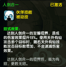 现技能效果:达到人剑合一的至臻境界,造成的伤害效果提升15%。使用天外有仙攻击多个目标时,随若天外有仙技能攻击自标数增加,不会递减伤害效果。