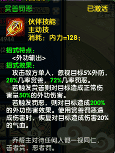 现调整效果:攻击敌方单人,忽视目标5%外防,28%几率赏善,72%几率罚恶。若触发赏善则对自标造成正常伤害量50%的外功伤害。若触发罚恶,则对目标造成200%的外功伤害效果。使用赏善罚恶造成伤害时,恢复对目标造成伤害20%的气血。